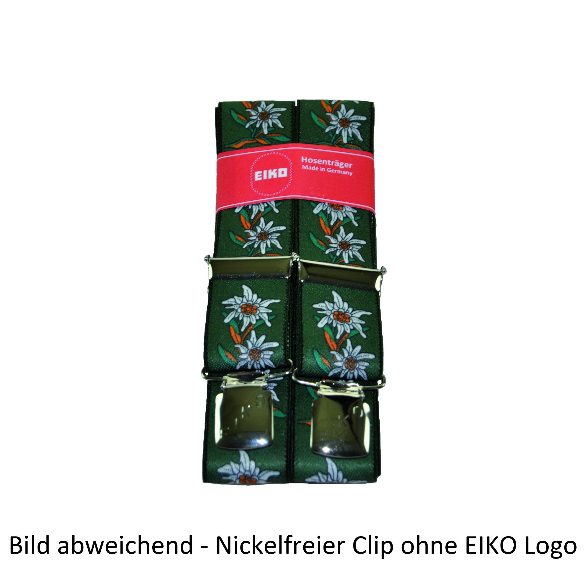 Produktinformationen "Eiko Hosenträger EIKO Clip nickelfrei, Edelweiss 36 mm, Leder-Rückenteil flaschengrün (70) 100cm"